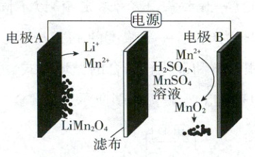 15.(2022·6月浙江卷,2分)通过电解废旧锂电池中的${LiMn_{2}O_{4}}$可获得难溶性的${Li_{2}CO_{3}}$和${MnO_{2}}$,电解示意图如下(其中滤布的作用是阻挡固体颗粒,但离子可自由通过。电解过程中溶液的体积变化忽略不计)。下列说法不正确的是 (
