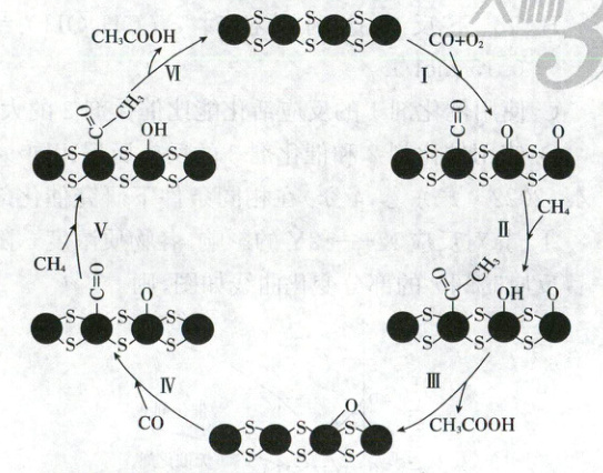 6. (2025·河南卷,3分)在${MoS_{2}}$负载的${Rh - Fe}$催化剂作用下,${CH_{4}}$可在室温下高效转化为${CH_{3}COOH}$,其可能的反应机理如图所示。