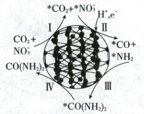 C.电催化${CO_{2}}$与${NO^{-}_{3}}$生成${CO(NH_{2})_{2}}$的反应方程式:${CO_{2} + 2NO^{-}_{3} + 18H^{+} \xlongequal[催化剂]{通电} CO(NH_{2})_{2} + 7H_{2}O}$
