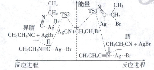 14. (2024·贵州卷,3分)${AgCN}$与${CH_{3}CH_{2}Br}$可发生取代反应,反应过程中${CN^{-}}$的C原子和N原子均可进攻${CH_{3}CH_{2}Br}$,分别生成腈(${CH_{3}CH_{2}CN}$)和异腈(${CH_{3}CH_{2}NC}$)两种产物。通过量子化学计算得到的反应历程及能量变化如图(TS为过渡态,Ⅰ、Ⅱ为后续物)。