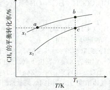 7.$(2023·$湖南卷,$3$分)向一恒容密闭容器中加入$1molCH_4$和一定量的$H_2O$,发生反应:$CH_4(g)+H_2O(g)\rightleftharpoons CO(g)+3H_2(g)$。$CH_4$的平衡转化率按不同投料比$x[x=\frac{n(CH_4)}{n(H_2O)}]$随温度的变化曲线如图所示。下列说法错误的是 (