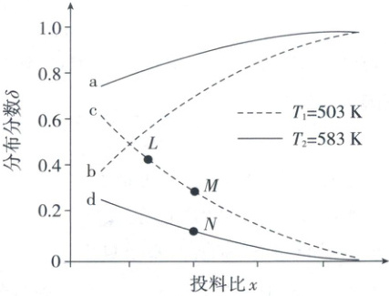 5.D 平衡图像 生成$CH_{3}COOH$的反应为主反应,生成$CH_{3}COOCH_{3}$的反应为副反应,所以曲线a、b为$CH_{3}COOH$分布分数曲线,曲线c、d为$CH_{3}COOCH_{3}$分布分数曲线。增大投料比$x$,$CH_{3}COOH$占比增大,所以投料比$x$代表$\frac{n(CO)}{n(CH_{3}OH)}$, A错误;曲线c代表503K时$CH_{3}COOCH_{3}$分布分数