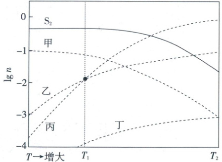 (填“$>$”“$<$”或“$=$”)0。(3)$T_{1}$温度下,体系达平衡时,乙线、丙线所示物种的物质的量相等,若丁线所示物种为$a\ mol$,则${S_{2}}$为