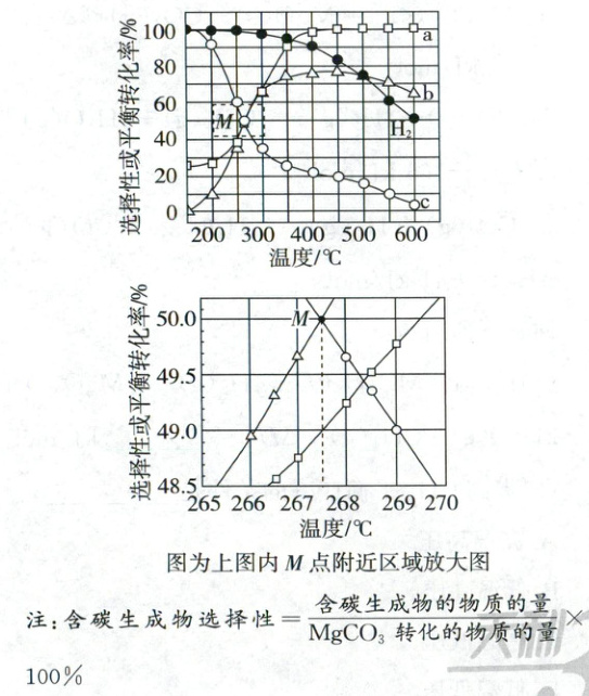 (4)①温度升高,$H_2$的平衡转化率减小,说明反应II逆向移动;温度升高,反应I平衡正向移动,$MgCO_3$的平衡转化率增大,$CO_2$选择性增大,$CH_4$选择性减小,可知c表示$CH_4$选择性,不发生反应III时$CH_4$和$CO_2$的选择性之和为100%,由M点时b和c曲线对应数值均为50%可知,b代表$CO_2$的选择性。②M点,$CO_2$的选择性和$CH_4$选择性均为50%,$MgCO_3$的平衡转化率为49%,$n(CO_2)_平=n(CH_4)_平=0.245mol$,利用三段式: