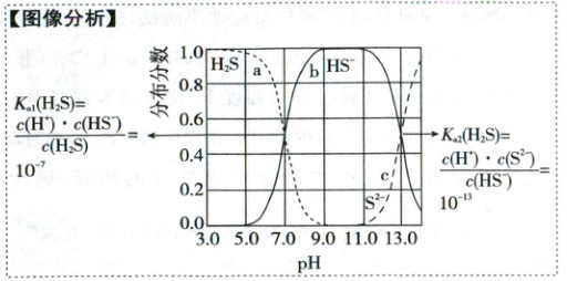 由【图像分析】可知,曲线a、b、c分别表示$H_2S$、$HS^-$、$S^{2-}$的分布分数,A项错误;由【图像分析】可知,电离常数$K_{a1}(H_2S) = \frac{c(H^+) · c(HS^-)}{c(H_2S)} = 10^{-7}$,则硫化钠的$K_{h2} = \frac{K_w}{K_{a1}} = 1 × 10^{-7}$,则$pK_{h2}$约为7,B项正确;$NaOH + H_2S \longrightarrow NaHS + H_2O$,由于$H_2S$气体可溶于水,所以$1.0\ L\ 1\ mol/L$的$NaOH$溶液吸收$H_2S$气体的物质的量大于$1\ mol$,C项正确;硫化氢气体有毒,燃烧产物$SO_2$有毒且对环境造成污染,所以不能向燃气中掺入微量硫化氢气体以示警燃气泄漏,D项错误。
