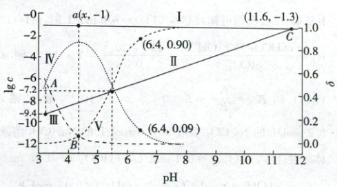 $Cu^{2+} + L^{3-} \rightleftharpoons [CuL]^-$中$K=\frac{c([CuL]^-)}{c(Cu^{2+})· c(L^{3-})}$,在图像中找到Ⅲ、Ⅳ线交点A,对应$L^{3-}$浓度为$10^{-9.4} mol/L$,因此$K=10^{9.4}$,A正确;同理,找到Ⅰ、Ⅱ的交点C(此时$HL^-$和$L^{3-}$的浓度相等),pH=11.6,代入$HL^- \rightleftharpoons H^+ + L^{3-}$,$K=\frac{c(H^+)· c(L^{3-})}{c(HL^{2-})}=10^{-11.6}$,B正确;A.$Cu^{2+} + L^{3-} \rightleftharpoons [CuL]^-$ $K=\frac{c([CuL]^-)}{c(Cu^{2+})· c(L^{3-})}=10^{8.4}$,B.$[CuL]^- + L^{3-} \rightleftharpoons [CuL_2]^{4-}$ $K=\frac{c([CuL_2]^{4-})}{c([CuL]^-)· c(L^{3-})}=10^{7.2}$,反应A+反应B对应的$K_总=\frac{c([CuL_2]^{4-})}{c(Cu^{2+})· c^2(L^{3-})}=10^{16.6}$,找到B点,$Cu^{2+}$、$[CuL_2]^{4-}$浓度相等,可求得$c(L^{3-})=10^{-8.3} mol/L$,由a点可知,$HL^-$浓度为$0.1 mol/L$,代入$K=\frac{c(H^+)· c(L^{3-})}{c(HL^{2-})}=10^{-11.6}$可求得$c(H^+)=10^{-4.3} mol/L$,pH=4.3,C错误;当pH=6.4时,经计算可知$c\{[CuL_2]^{4-}\}=0.002×0.9 mol/L>c\{[CuL]^-\}=0.002×0.09 mol/L$,代入B反应的K可算出$c(L^{3-})=10^{-6.2} mol/L$,代入B项中的K值算出$c(HL^-)=0.1 mol/L$,D正确。