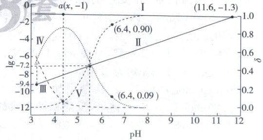 6. (2025·河北卷,3分)已知${Cu^{2+}}$和${L^{3-}}$结合形成两种配离子${[CuL]^{-}}$和${[CuL_{2}]^{4-}}$。常温下,0.100 mol/L的${H_{3}L}$和0.002 mol/L的${CuSO_{4}}$混合溶液中,${HL^{2-}}$和${L^{3-}}$的浓度对数$\lg c$(实线)、含铜微粒的分布系数$\delta$(虚线)[例如$\delta_{{Cu^{2+}}}=\dfrac{c({Cu^{2+}})}{c({Cu^{2+}})+c({[CuL]^{-}})+c({[CuL_{2}]^{4-}})}$]与溶液pH的关系如图所示: