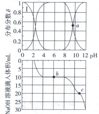 5.C 电解质溶液曲线分析 随着溶液pH增大,$+NH_3CH_2COOH$的分布分数逐渐减小,$+NH_3CH_2COO^-$的分布分数先增大后减小,$NH_2CH_2COO^-$的分布分数逐渐增大,则曲线Ⅰ对应的离子是$+NH_3CH_2COOH$,A正确;由图像可知a点处$\delta(+NH_3CH_2COO^-)=\delta(NH_2CH_2COO^-)$,$K_a2=\frac{c(NH_2CH_2COO^-)· c(H^+)}{c(+NH_3CH_2COO^-)}=c(H^+)=10^{-9.6} mol/L$,对应的pH为9.6,B正确;b点处滴入$NaOH$溶液的体积为$10 mL$,溶液的溶质为等浓度的$+NH_3CH_2COO^-$和$NaCl$,$+NH_3CH_2COO^-$的电离常数$K_a1=10^{-9.6}$,$+NH_3CH_2COO^-$的水解常数$K_h2=\frac{K_w}{K_a1}=\frac{10^{-14}}{10^{-2.4}}=10^{-11.6}$,$+NH_3CH_2COO^-$的电离程度大于其水解程度,则$c(+NH_3CH_2COOH)<c(NH_2CH_2COO^-)$,C错误;c点处滴入$NaOH$溶液的体积为$20 mL$,溶液的溶质为等浓度的$NH_2CH_2COONa$和$NaCl$,溶液中存在质子守恒$2c(+NH_3CH_2COOH)+c(+NH_3CH_2COO^-)+c(H^+)=c(OH^-)$,D正确。