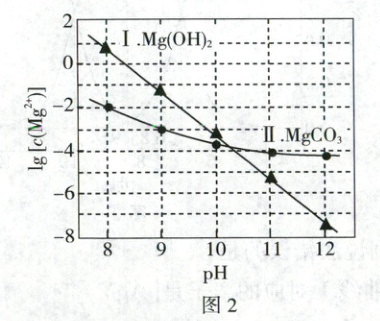 ②图2中曲线Ⅰ的离子浓度关系符合$c({Mg^{2+}})· c^{2}({OH^{-}})=K_{sp}[{Mg(OH)_{2}}]$;曲线Ⅱ的离子浓度关系符合$c({Mg^{2+}})· c({CO^{2-}_{3}})=K_{sp}({MgCO_{3}})$[注:起始$c({Na_{2}CO_{3}})=0.1\ mol/L$,不同${pH}$下$c({CO^{2-}_{3}})$由图1得到]。