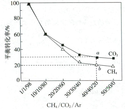 (5)恒温恒压密闭容器中,投入不同物质的量之比的${CH_{4}/CO_{2}/Ar}$混合气,投料组成与${CH_{4}}$和${CO_{2}}$的平衡转化率之间的关系如图所示。