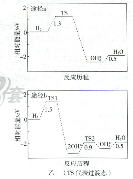 (4)研究发现${CaH_{2}(s)}$对${Fe_{2}O_{3}(s)}$的还原性主要来自于其产生的${H_{2}}$。一般认为${H_{2}}$在${Fe_{2}O_{3}}$表面被氧化成${H_{2}O}$有两种可能途径,图乙是理论计算得到的相对能量变化图,据此推测途径