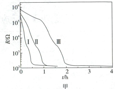(2)图甲分别是$260\ ^{\circ}C$、$280\ ^{\circ}C$和$300\ ^{\circ}C$下${CaH_{2}(s)}$还原${Fe_{2}O_{3}(s)}$过程中反应体系电阻$R(\Omega)$随反应时间$t({h})$变化的曲线,可用