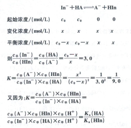 即可得到$K_\mathrm{a}(\mathrm{HA}) = K × K_\mathrm{a}(\mathrm{HIn}) =\frac{1}{9.0} × 3.6 × 10^{-20} =4.0 ×$