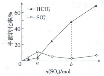 ② $a\sim b\ {mol}$,${HCO^{-}_{3}}$平衡转化率上升而${SO^{2-}_{3}}$平衡转化率下降,结合方程式解释原因:_______