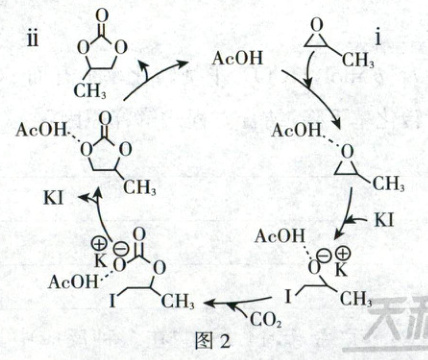 (2)在非水溶剂中,将${CO_{2}}$转化为化合物ⅱ(一种重要的电子化学品)的催化机理示意图如图$2$,其中的催化剂有_______和_______。