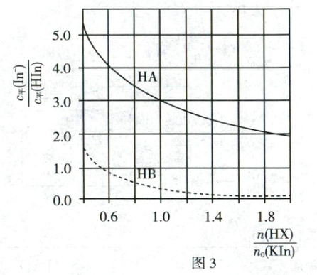 (3)①由图知:$\frac{n(\mathrm{HA})}{n_0(\mathrm{KIn})} =1.0$ 时,$\frac{c_\mathrm{平}(\mathrm{In^-})}{c_\mathrm{平}(\mathrm{HIn})} =3.0$。