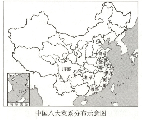 (1)由图可知,八大菜系主要分布在秦岭—淮河以南地区。