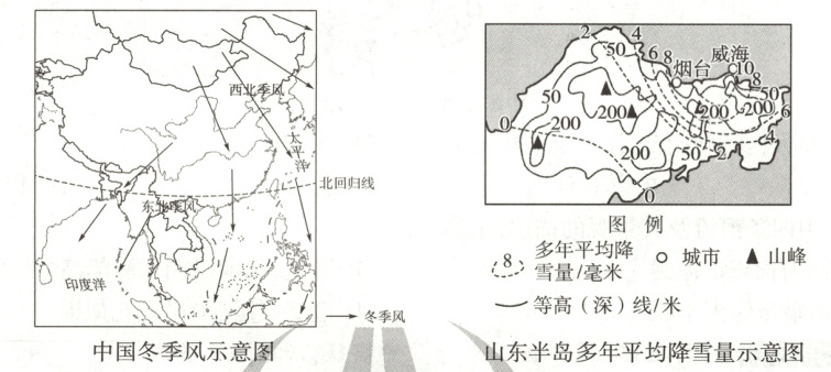 材料二 下图分别为中国冬季风示意图和山东半岛多年平均降雪量示意图。