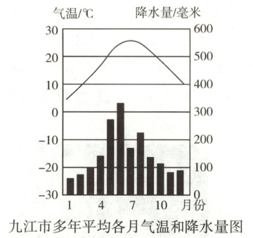 (3)读图可知,九江市属于亚热带季风气候,夏季高温多雨,冬季温和少雨。