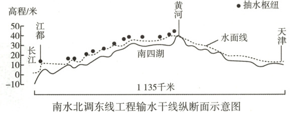习近平总书记在河南省调研南水北调后续工程时指出,自古以来,我国基本水情一直是夏汛冬枯、北缺南丰,水资源时空分布极不均衡。读南水北调东线工程输水干线纵断面示意图,完成3~5题。