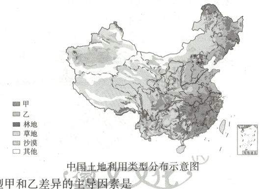 1. 导致图中土地利用类型甲和乙差异的主导因素是 (