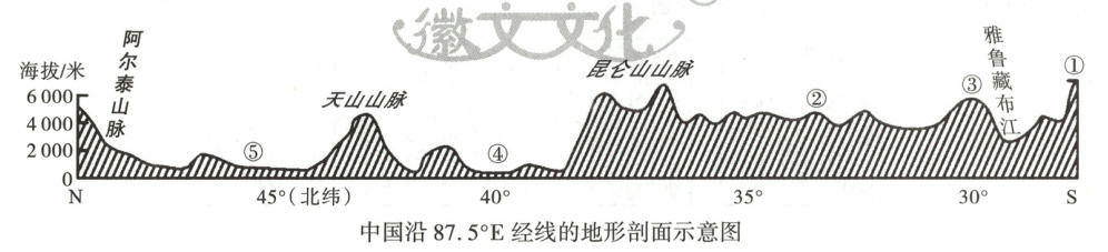 沿着87.5°E经线前行,宛如展开一幅雄浑壮丽的山河长卷,巍峨高原、峻岭重山、广袤沙漠、绿洲沃野相间分布。读中国沿87.5°E经线的地形剖面示意图,完成3、4题。