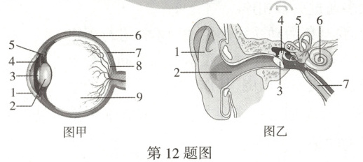12. 人从外界获取的信息大部分来自眼和耳。如图所示,图甲是眼球的基本结构示意图,图乙是耳的基本结构示意图。请据图回答下列问题。