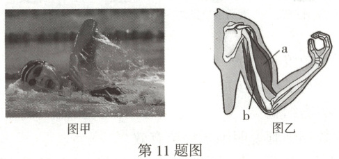 11. 如图所示,图甲是运动员参加800米自由泳比赛现场的图片,图乙是游泳时屈肘动作的示意图。请据图回答下列问题。