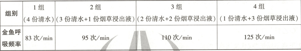 (2)实验的变量是烟草浸出液的浓度,观察指标是金鱼呼吸频率。因此,此实验的目的是探究烟草浸出液对金鱼呼吸频率的影响。