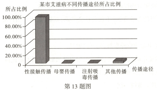 13. 艾滋病(AIDS),又称获得性免疫缺陷综合征,是由人类免疫缺陷病毒(HIV)引起的传染病。HIV把人体的T淋巴细胞作为主要的攻击目标。如图所示的是某市进行的艾滋病传播途径的调查结果,请据图回答下列问题。