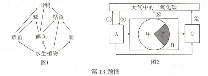 13. 近日,某中学生物小组的同学对巢湖半岛国家湿地公园进行了考察。如图所示,图1是同学们在考察湿地生态系统时绘制的食物网简图,图2是该生态系统中各成分之间的关系示意图,其中甲、乙之间存在捕食关系,扇形图表示它们体内有毒物质的相对含量。请据图回答下列问题。