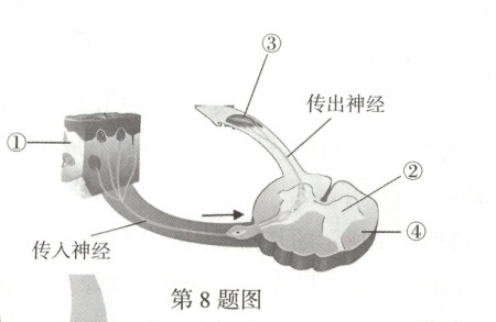8. 手被针扎立即缩回是一种缩手反射。如图所示的是缩手反射的示意图,下列叙述正确的是(