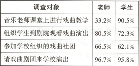 ①请戏曲剧团来学校演出,是最受师生欢迎的形式。②对于音乐课堂上进行戏曲教学的实施方式,师生态度截然不同。