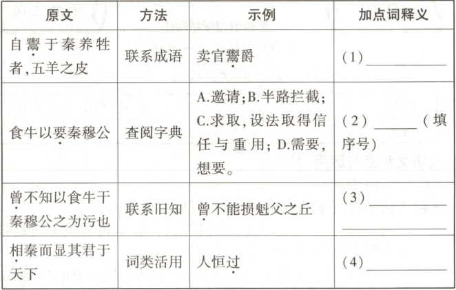 (用自己的话回答),【乙】文孟子针对(2)“百里奚自鬻于秦养牲者,五羊之皮;食牛以要秦穆公