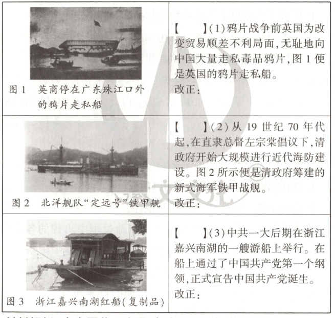 16. 船见证了近代中国的屈辱与探索。辨别下列船舶背后故事的正误,在该题前的括号内正确的打“√”;错误的打“×”,并加以改正。