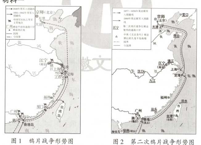 (2)比较材料一中的图1与图2,结合所学知识,归纳两次鸦片战争后西方侵略势力的变化。(6分)