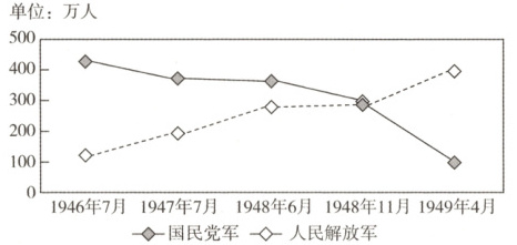 14. 下图是解放战争时期国民党军与人民解放军兵力变化示意图。这一变化主要表明(
