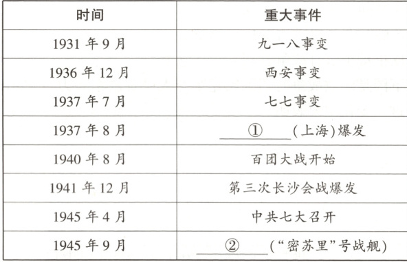 (1)内容:①淞沪会战;②日本政府正式签署投降书。影响:淞沪会战打破了日本三个月灭亡中国的迷梦,激发了全国人民斗志。日本政府正式签署投降书,标志着中国长达14年的抗日战争取得了最后的胜利,世界反法西斯战争胜利结束。