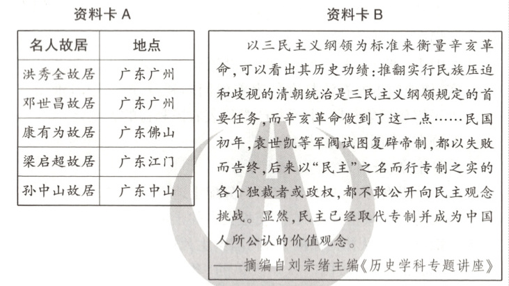 (3) 根据材料二资料卡 B,指出辛亥革命的指导思想是什么。(2 分)结合两则材料,说说影响中国早期现代化进程发展的因素有哪些。(4 分)