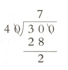 6. 爸爸去给汽车加油,加了40升汽油花费300元,求汽油的单价时,菲菲列出了如图的竖式,其中余数2表示(