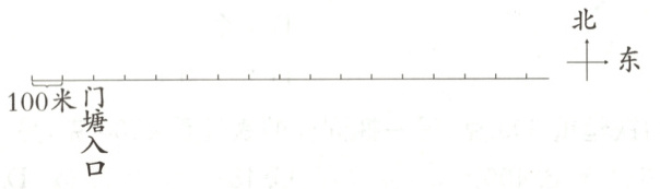 (1) 从门塘入口向东量7个单位(每个单位100米),在对应位置标▲。