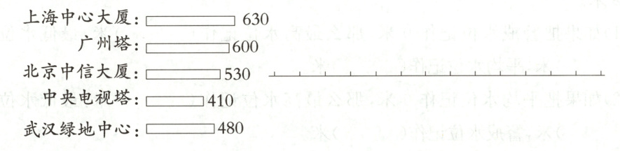 4. 下面是我国五座著名的高层建筑的近似高度的统计。请你选择一座你喜欢的建筑,以它的高度为0点,用正、负数在下面右图中标出其他建筑的高度。(规定向右为正,向左为负)(10分)
