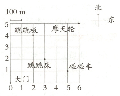 (3)海盗船在大门以东600米,再往北200米处,请你用“△”在图中标出海盗船的位置。(2分)