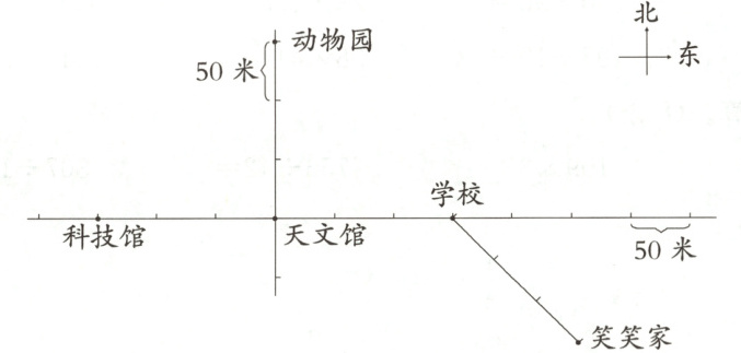 )米处。(3)淘气从天文馆出发,向东走 100 米表示为 $ + 100 $ 米,那向西走 150 米可以表示为(