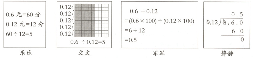 6. 新角度明晰算理 下面是四位同学计算$0.6÷0.12$的方法,正确的是(