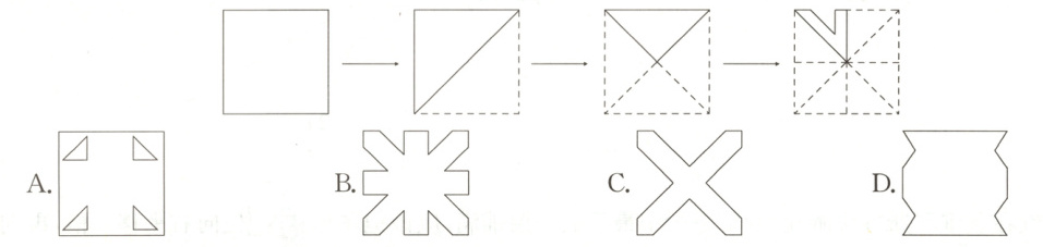 6. 新素养 几何直观 把一张纸按下面的顺序连续对折三次后剪去一个,打开后的图形是(