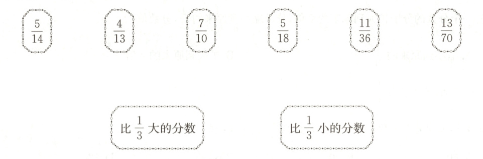 4. 比$\frac{1}{3}$大的分数:$\frac{5}{14}$'$\frac{7}{10}$ 比$\frac{1}{3}$小的分数:$\frac{4}{13}$'$\frac{5}{18}$'$\frac{11}{36}$'$\frac{13}{70}$
