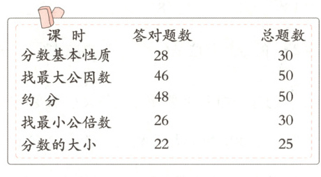 5. 28÷30=$\frac{28}{30}$=$\frac{280}{300}$ 46÷50=$\frac{46}{50}$=$\frac{276}{300}$ 48÷50=$\frac{48}{50}$=$\frac{288}{300}$ 26÷30=$\frac{26}{30}$=$\frac{260}{300}$ 22÷25=$\frac{22}{25}$=$\frac{264}{300}$ $\frac{288}{300}$>$\frac{280}{300}$>$\frac{276}{300}$>$\frac{264}{300}$>$\frac{260}{300}$ 答:小华应着重加强“找最小公倍数”这个课时的练习。