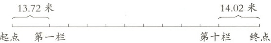5. 110 米栏是田径项目中的一项,下面是男子 110 米栏赛道示意图。第一栏至第十栏每栏之间的距离相等,每两栏之间的距离是多少?(5 分)