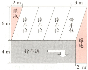 $(1)3×6=18(m^2) $答:每个停车位的面积是$18m^2。$$ (2)6×2÷2+(4+6+4)×2÷2=20(m^2) $答:绿地面积的总和是$20m^2。$